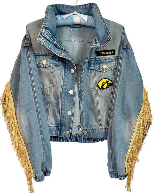 Reworked Distressed Iowa Game Day Denim Jean Jacket with Fringe