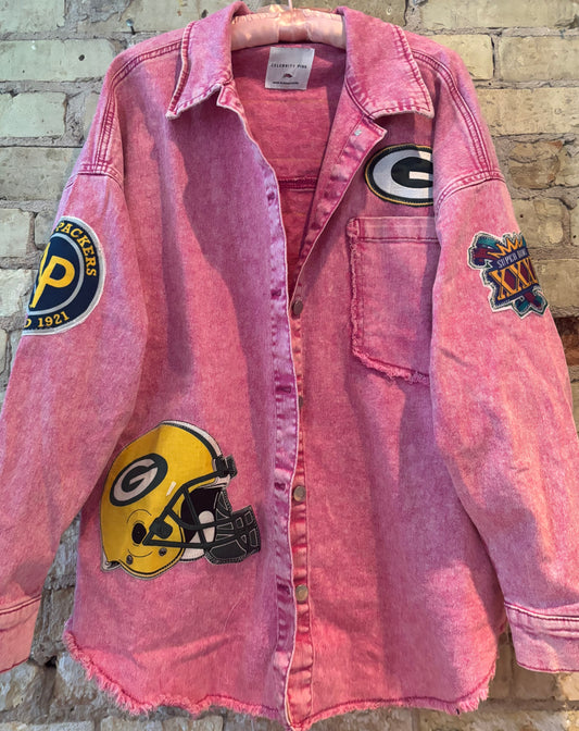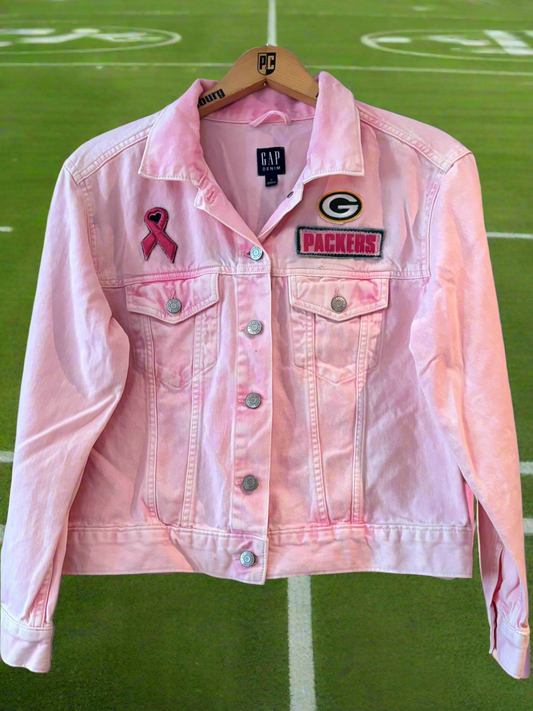 Reworked overdyed Retro Game Day Breast Cancer Awareness Denim Jean Jacket