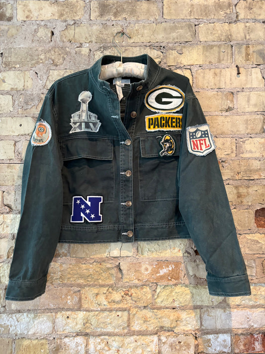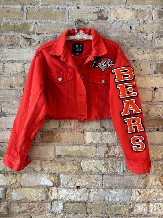 Reworked Over Dyed Game Day Cropped Denim Jean Jacket