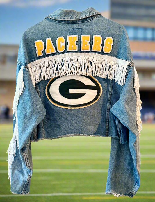 Reworked cropped Game Day Denim Jean Jacket with Fringe