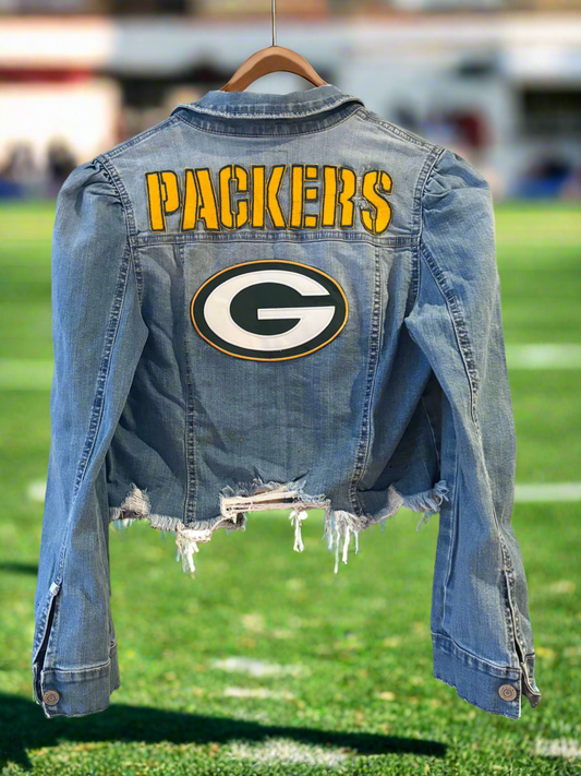 Reworked cropped and Distressed Game Day Denim Jean Jacket
