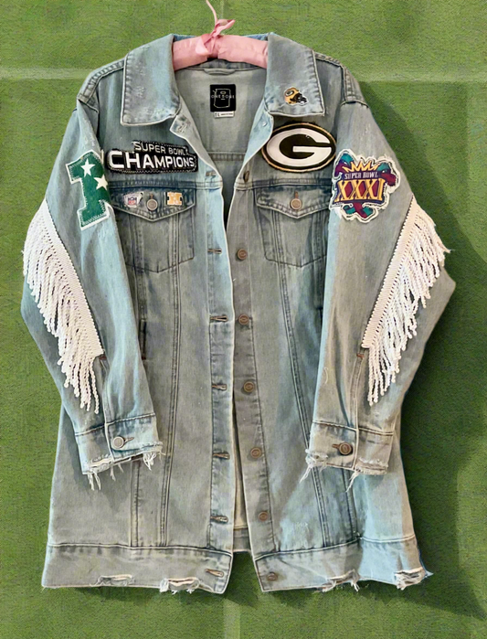 Reworked Packers Game Day Denim Jean Jacket with Fringe