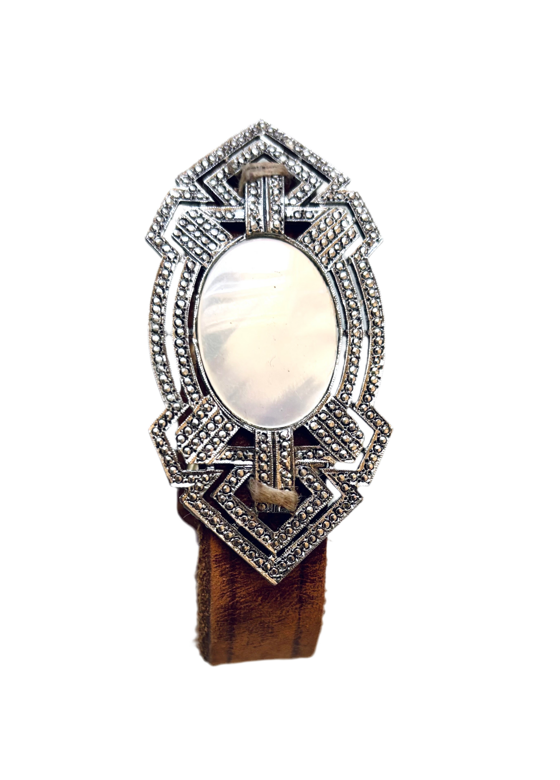 This Bracelet is designed using reclaimed Leather and a Vintage Steling silver Mother of Pearl broach secured tightly making this a gorgeous One of a kind Cuff.
