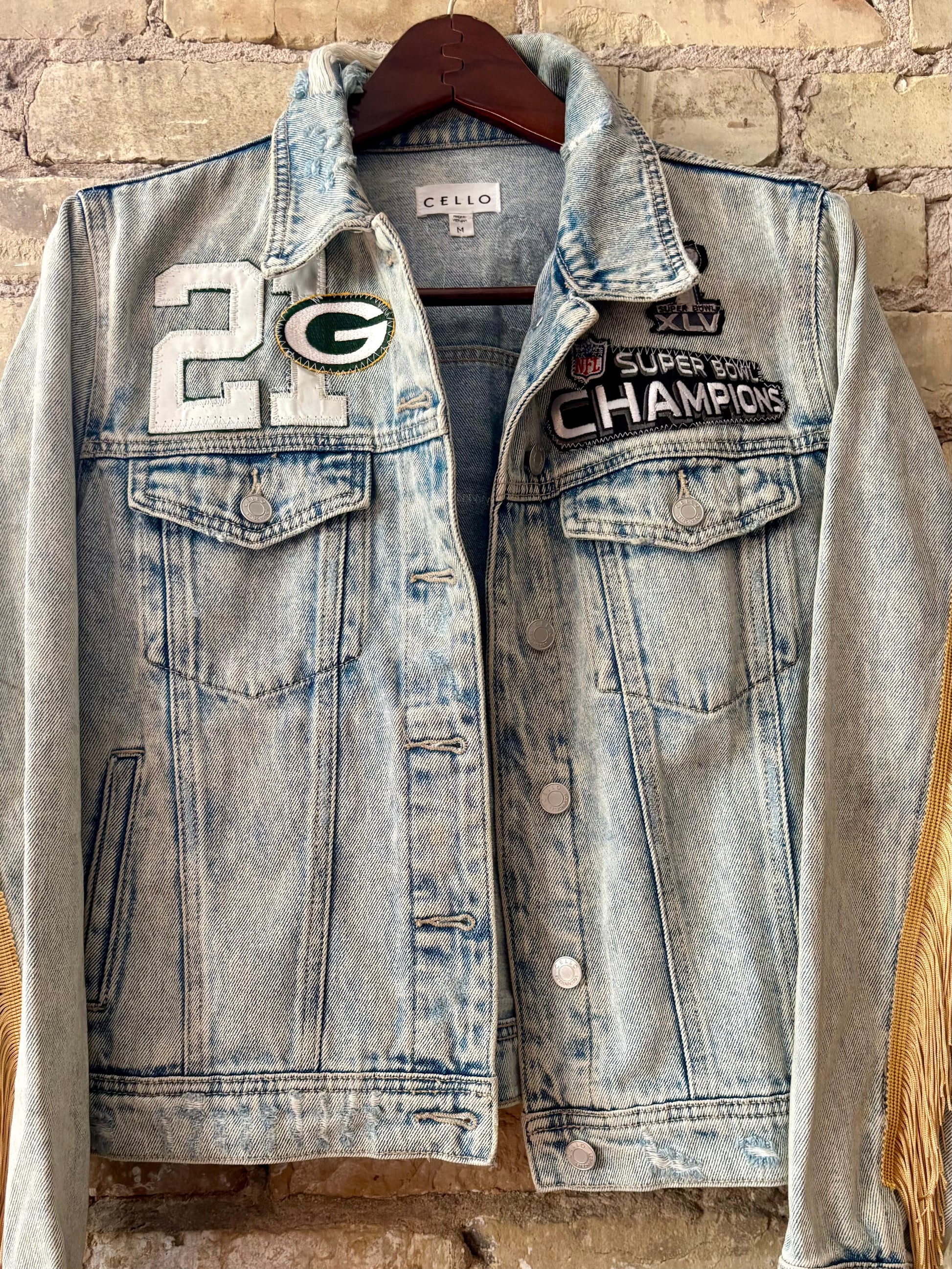 Reworked Distressed Game Day Denim Jean Jacket with Fringe