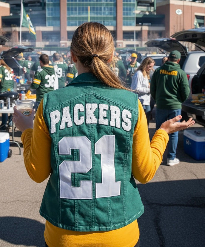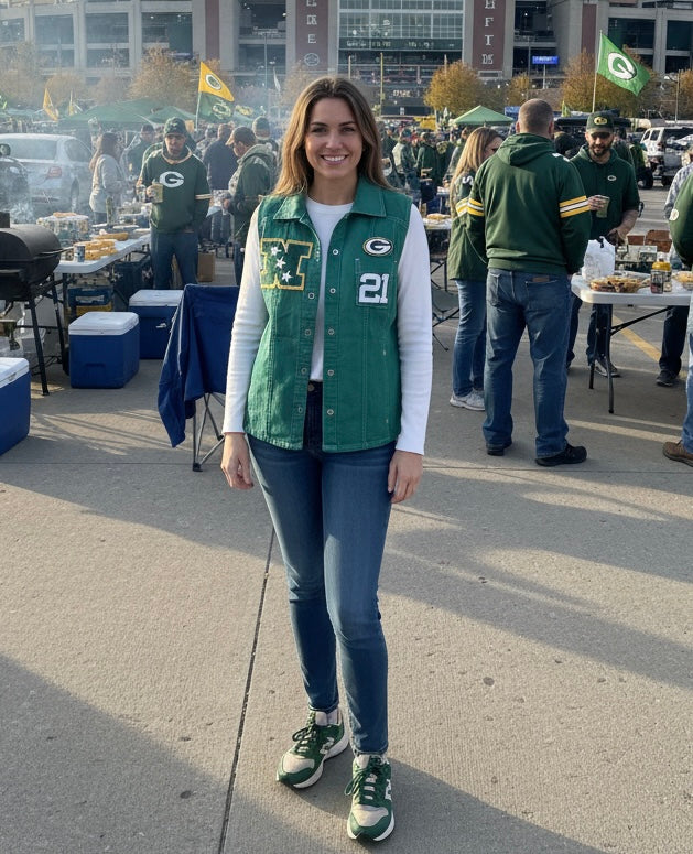 Reworked Packers over dyed Game Day Denim Jean Vest
